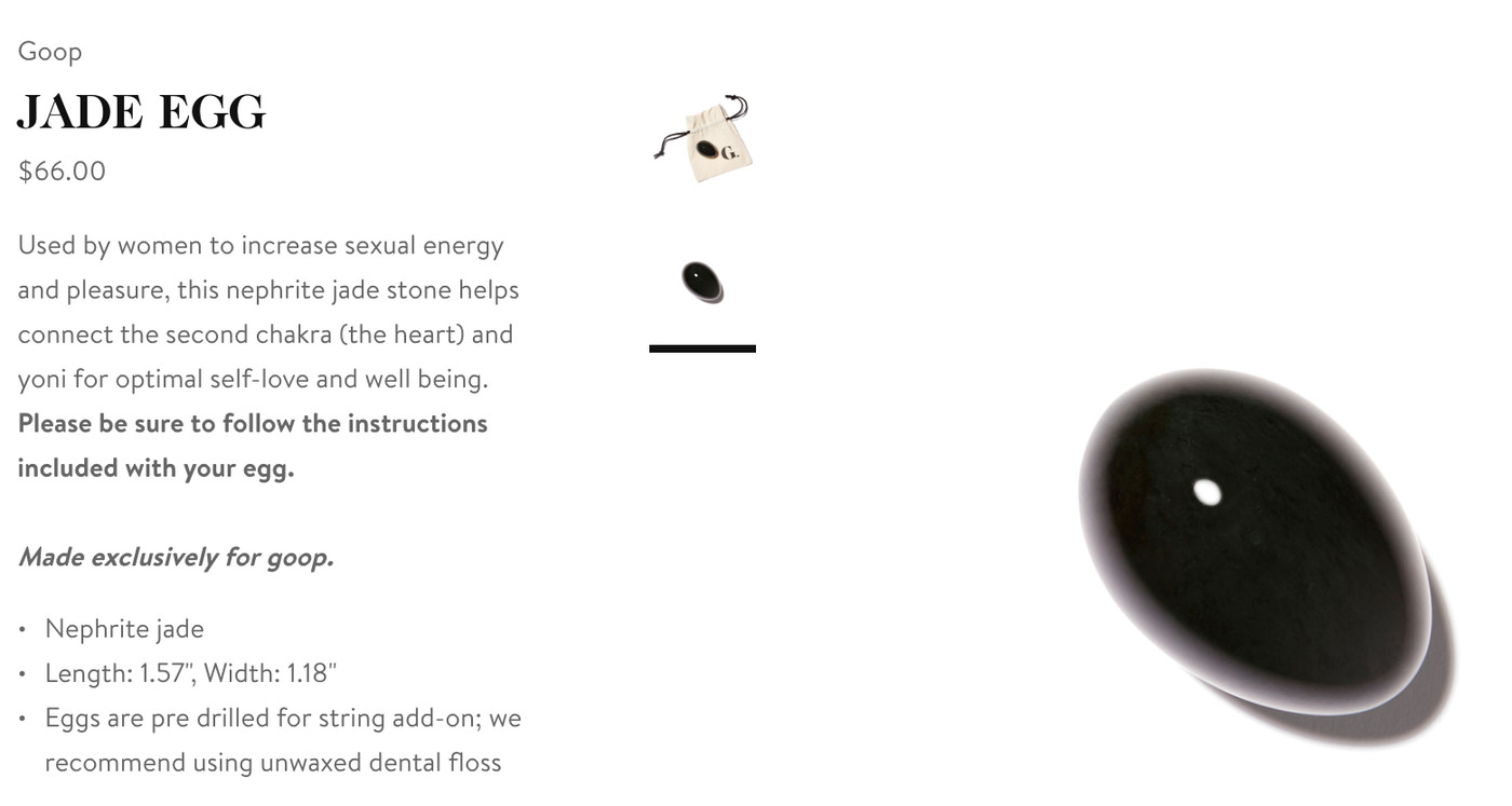 Goop에 따르면 이 구슬 모양 돌을 질내에 삽입하면 성 건강을 개선하고 호르몬을 균형잡히게 하며 자궁 내부 저하를 예방할 수 있다고 한다.